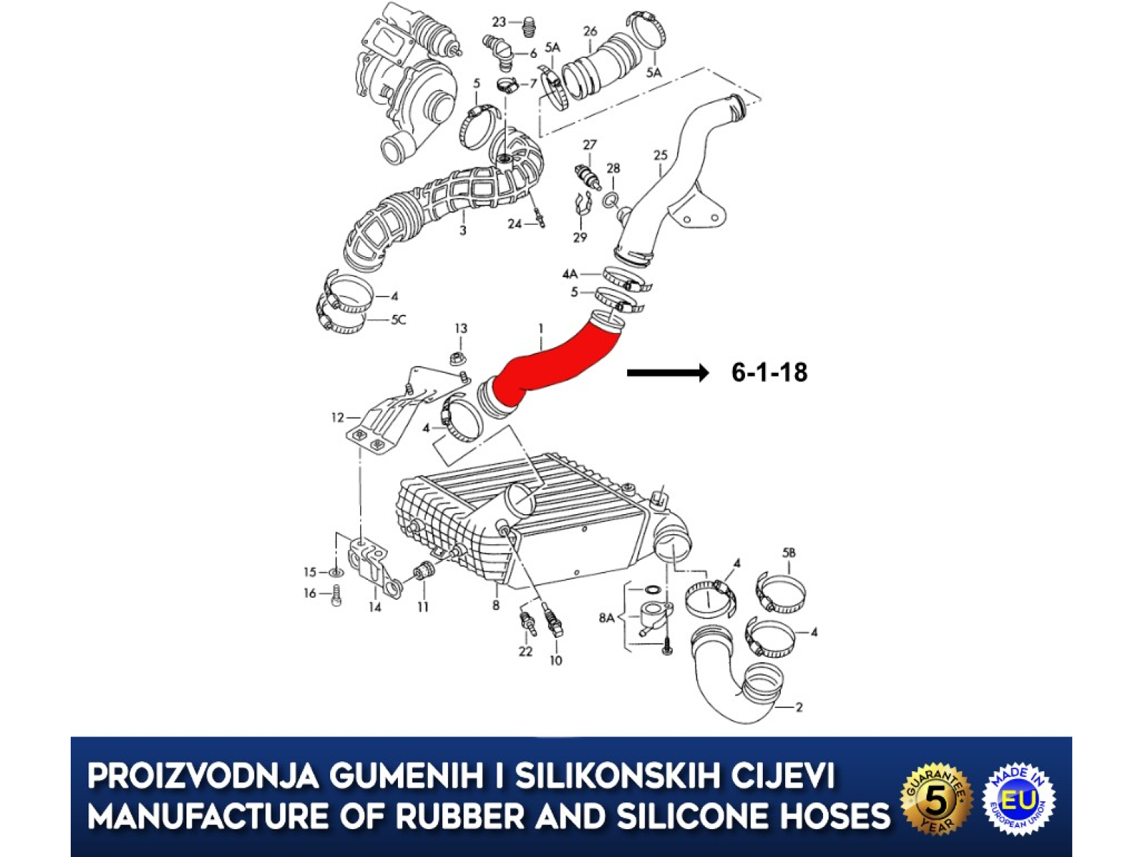 Gumeno crijevo intercoolera i turbine za AUDI 100 2.5 TDI, AUDI A6 2.5 TDI